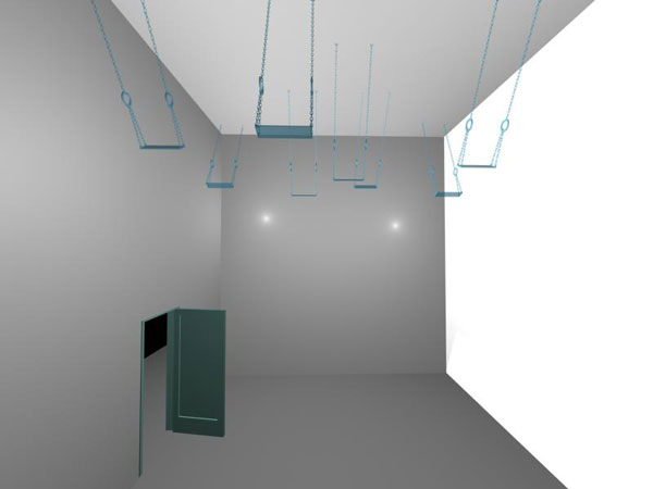 Setting up eight ceiling hooked glass swings.